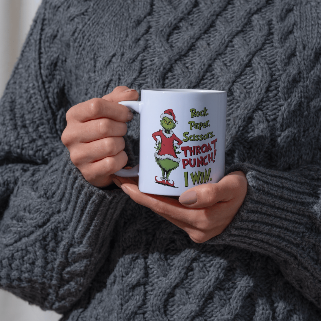 Tired of playing nice? This 11oz ceramic mug is for everyone who knows how to truly win at Rock, Paper, Scissors (with a little extra oomph!). Featuring a certain green holiday curmudgeon in his festive best, this mug boldly declares "Rock, Paper, Scissors. Throat Punch! I WIN." It's the perfect gift for the friend who's always up for a laugh, a little bit mischievous, and definitely has a competitive streak. Great for coffee, tea, or holding the tears of your defeated opponents.